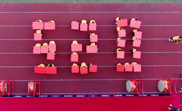 此時綠茵場上,方陣隊伍列隊完畢,操場上擺出巨型芯片造型,動作整齊劃一,場面生動震撼。
