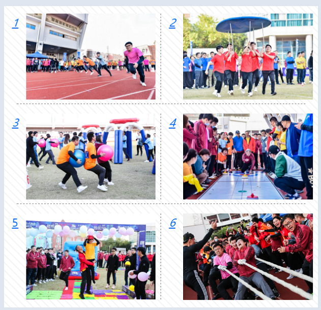 本屆運動會共設有六大比賽項目,分別為華虹速度(100米跑步),頂立“芯”天地(5人撐桿頂盤跑),同“芯”同行(5人聯合運球投籃),一片冰“芯”(旱地冰壺),砥礪前行(8人大型組合接力)及眾志成“芯”(多股拔河),各隊隊員們凝心聚力、團結一心、奮發拼搏,賽出風格,賽出水平。